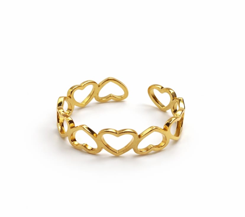 טבעת לבבות היא טבעת קלאסית בצבע זהב, עשויה סטיינלס סטיל איכותי ועמיד. העיצוב המינימליסטי והנקי מאפשר לענוד אותה בכל יום ולשלבם עם מגוון סגנונות לבוש – יומיומיים ואלגנטיים כאחד.