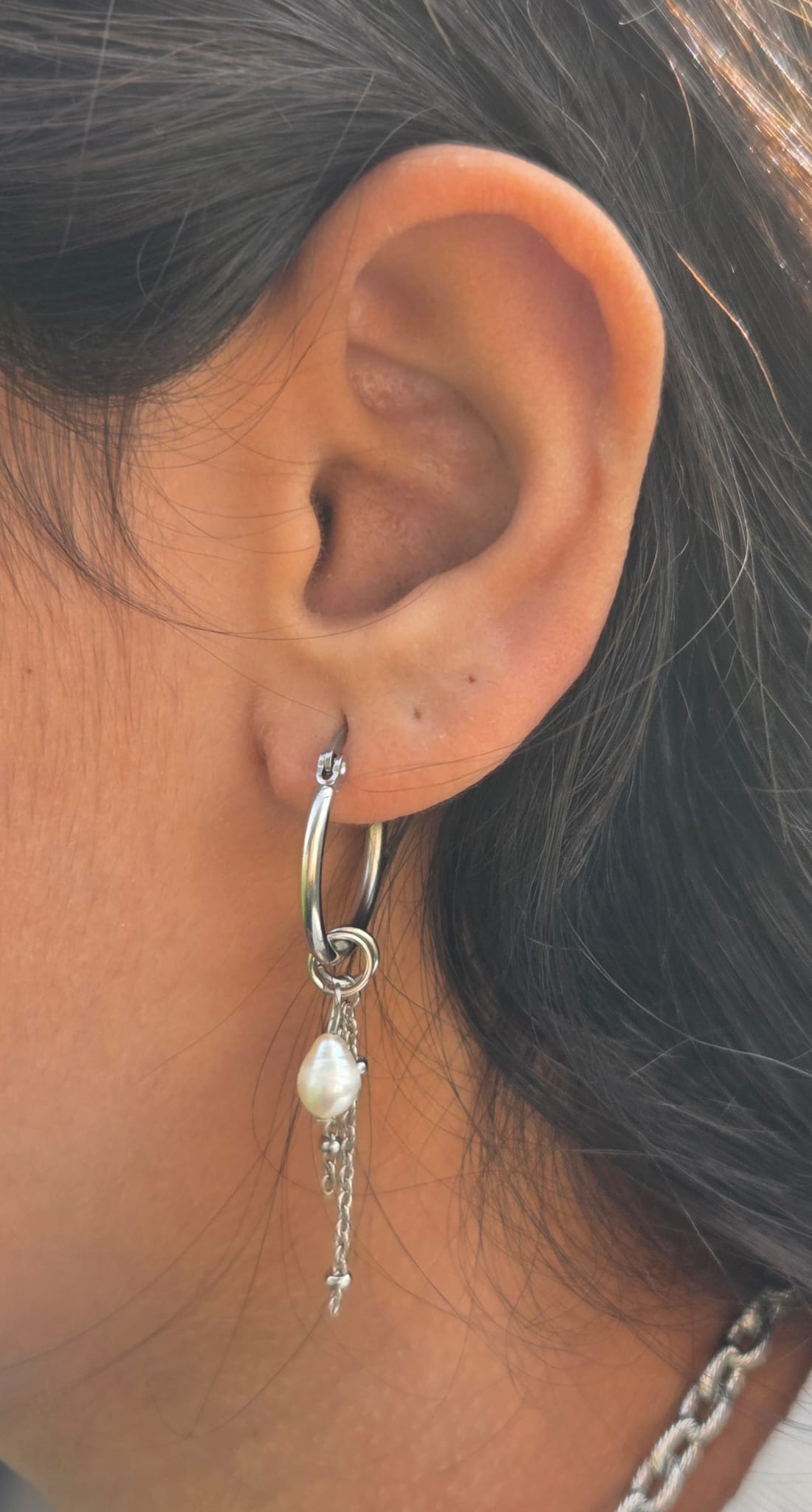 עגילי לינוי בצבע כסף הם עגילי חישוק עדינים עם שילוב של פנינה טבעית ושרשרת עדינה המשתלשלת מהחישוק