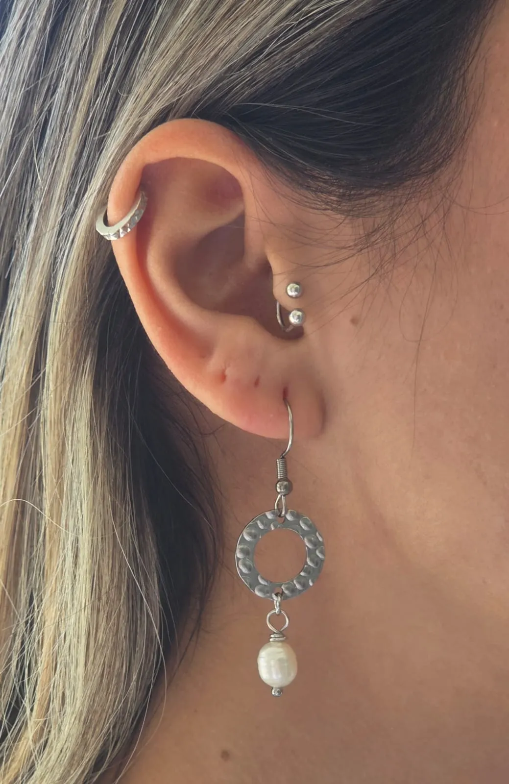 עגילי פנינית בצבע כסף הם עגילים אלגנטיים ועדינים, המשלבים סטיינלס סטיל איכותי עם פנינה תרבותית – למראה קלאסי, נשי ועל-זמני שמתאים לכל הזדמנות.